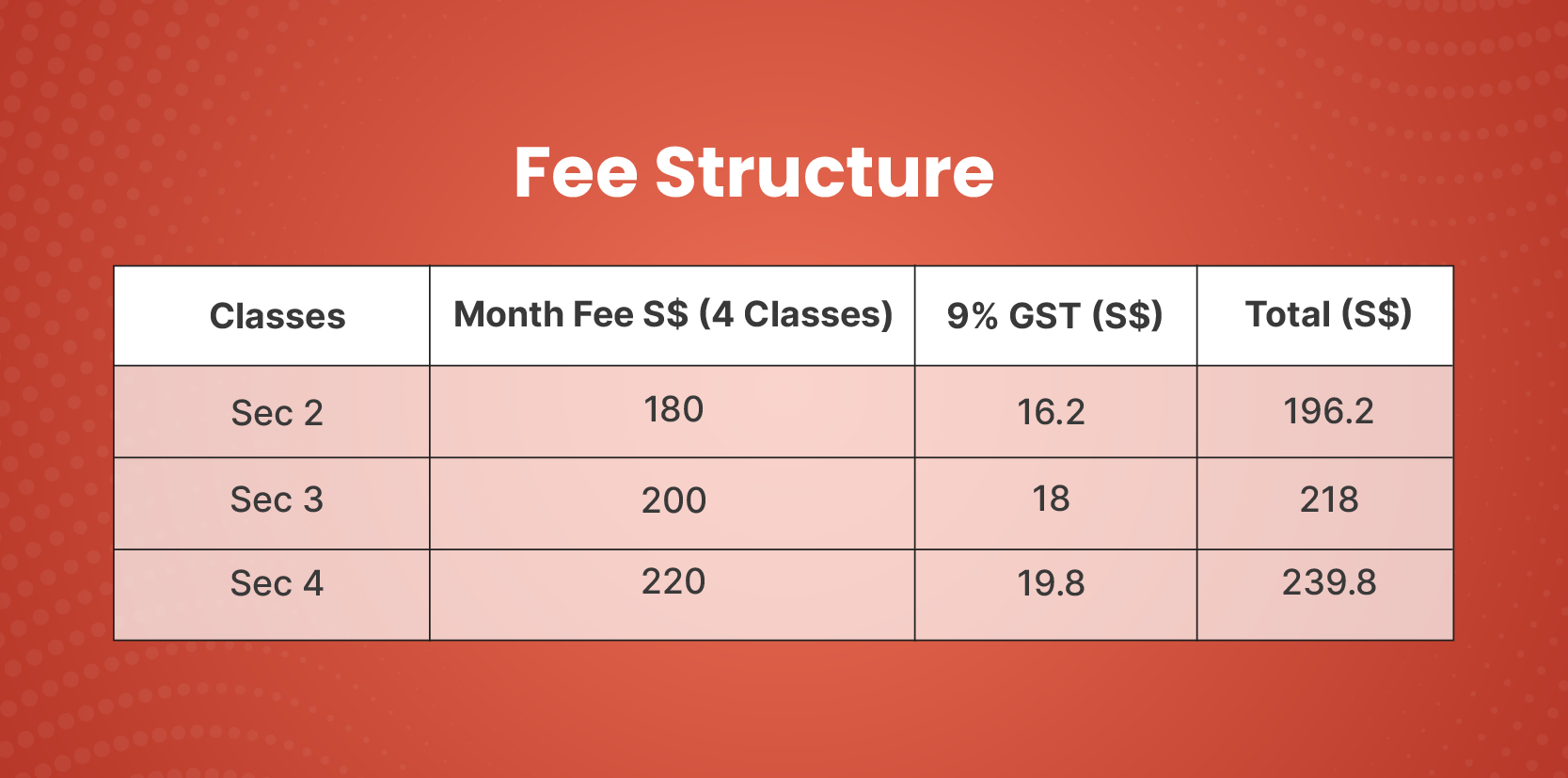 Students are grouped by their school grade level (e.g. Secondary 2, Secondary 3 etc.) so that lessons stay focused and relevant to their current school syllabus and upcoming examinations